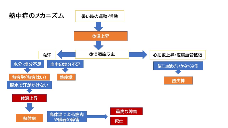など、気温や運動量など様々な要因が原因で上手く体温調節ができなくなり、熱中症にな ってしまいます。